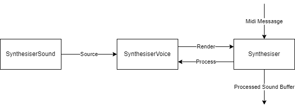 Synthesiser에서 renderNextBlock을 호출하면서 이런 미디 데이터와 버퍼를 같이 보내주면 (시작 시간과 길이도 같이) 연결된 Voice를 이용해 사운드를 렌더링합니다.